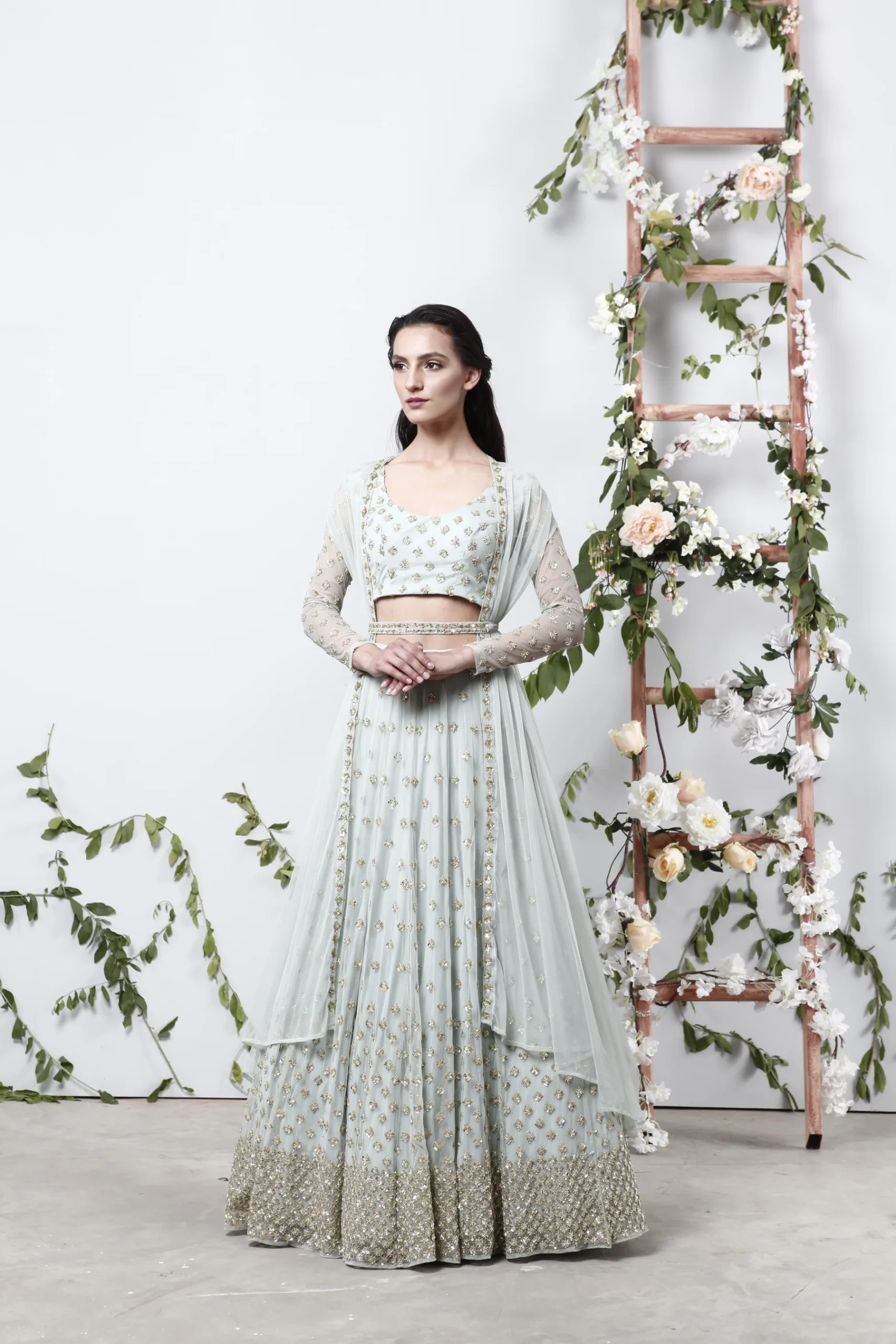 Featuring a POWDER BLUE LEHENGA SET IN RAW SILK.