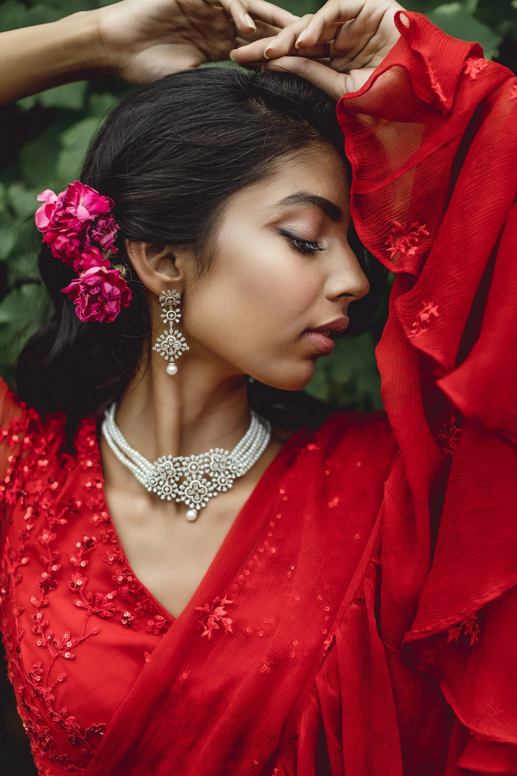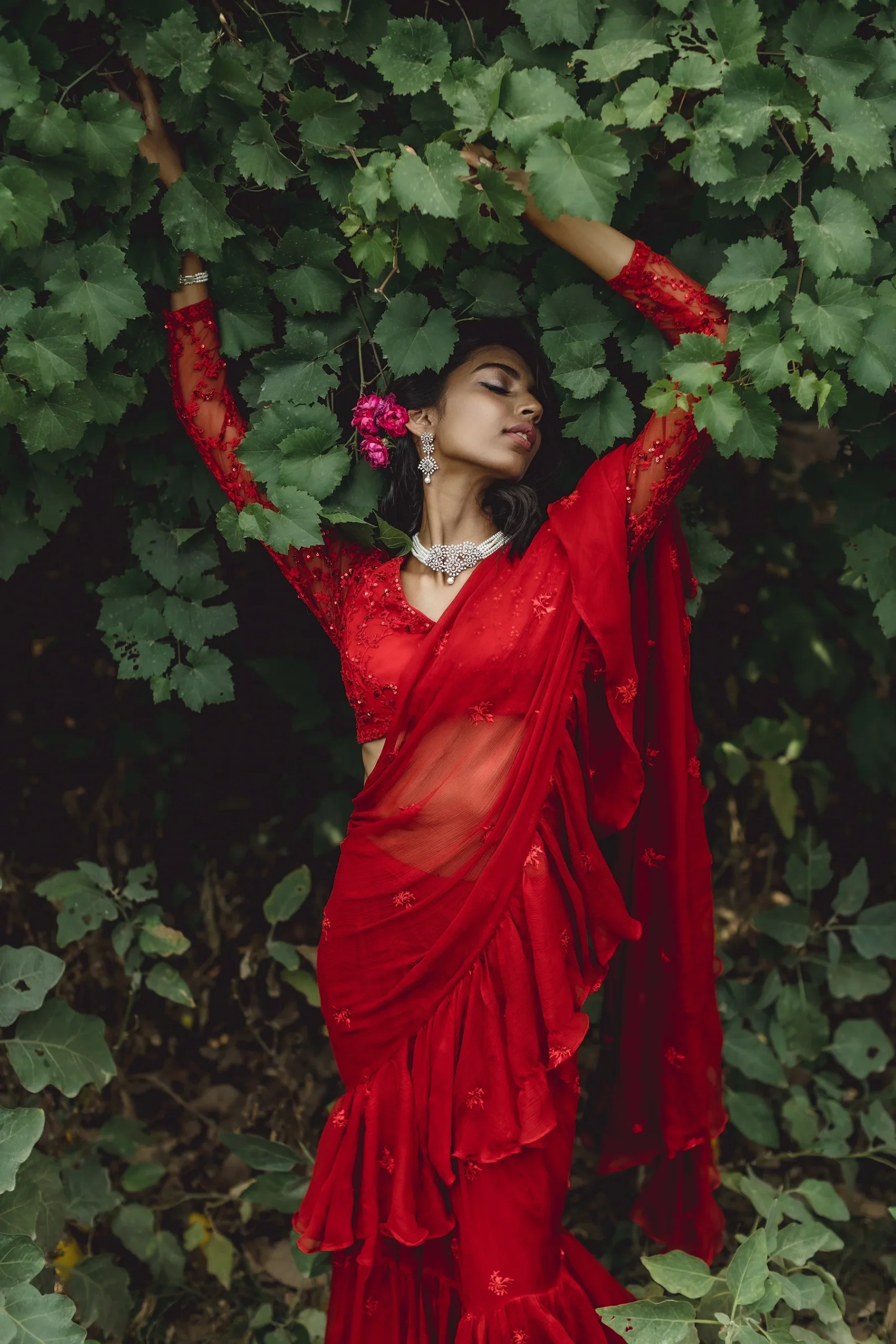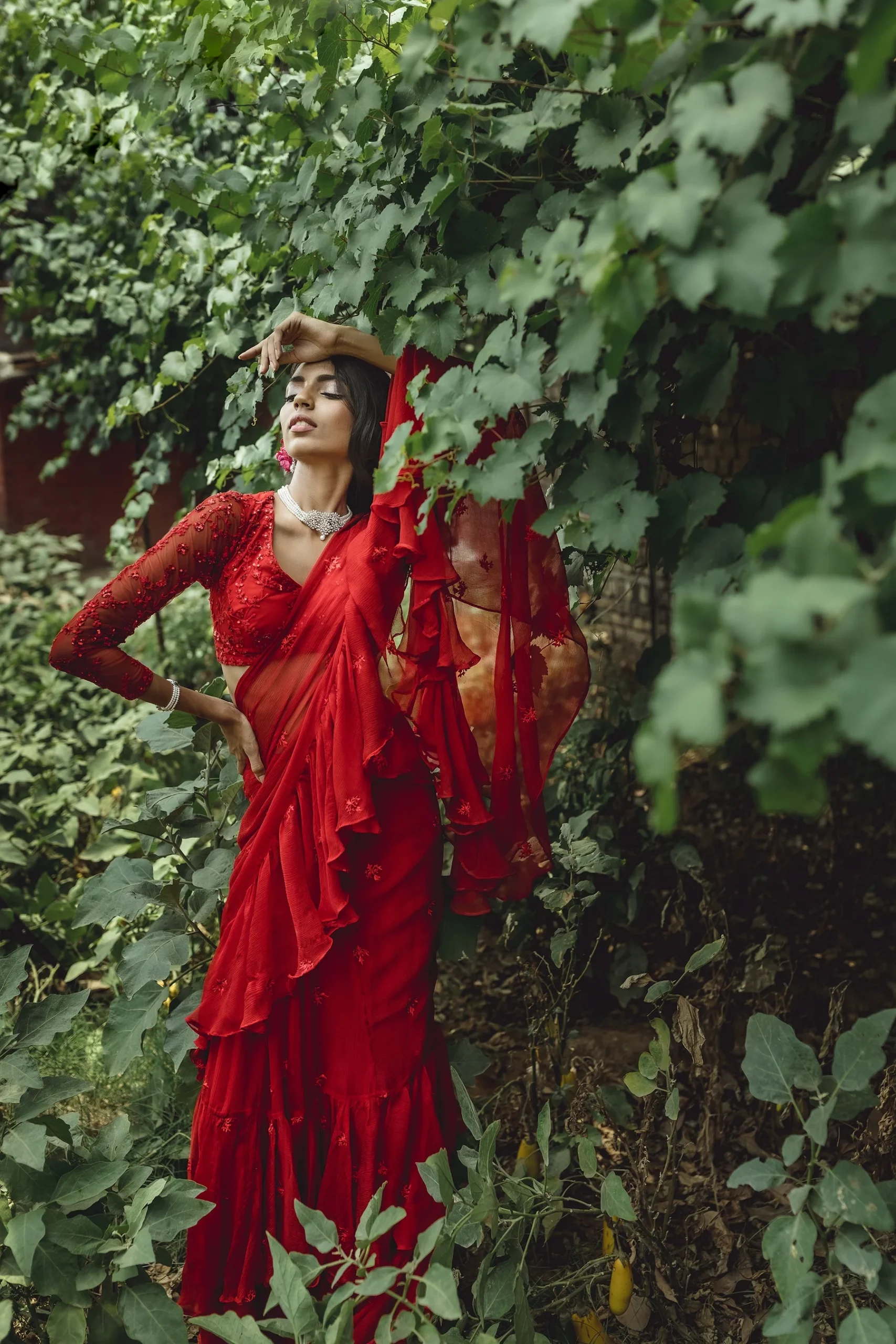 Featuring a RED THREADWORK RUFFLE SAREE SET IN CHIFFON.