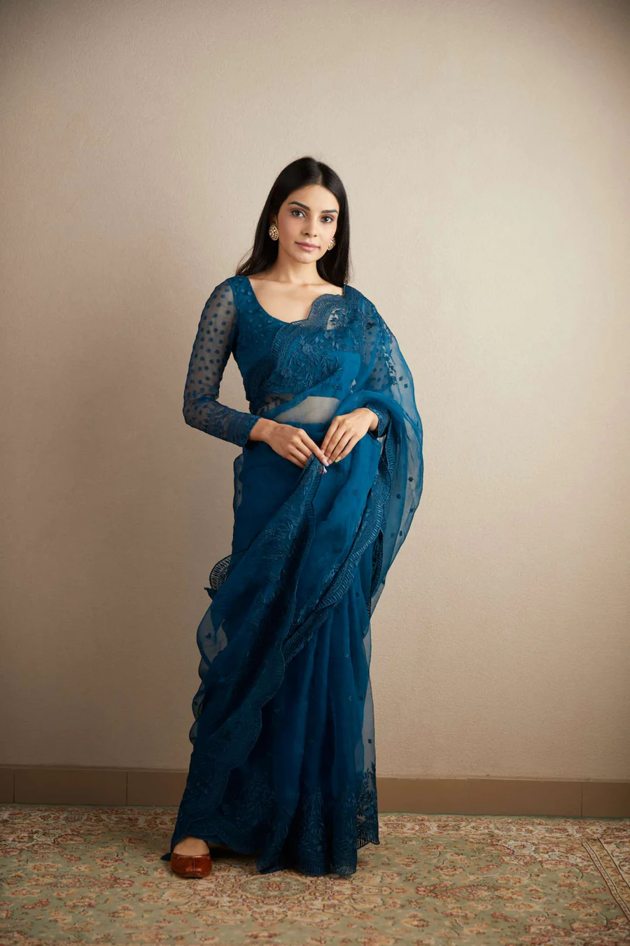 Featuring a Teal Blue Thread Work Saree Set in Organza.